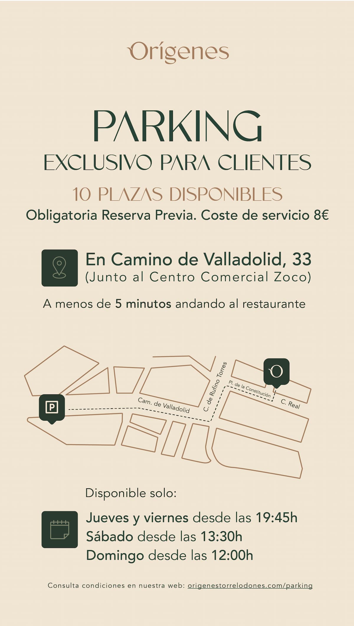 Las plazas de aparcamiento puestas a disposición de los clientes de Orígenes Torrelodones constituyen una cesión temporal y onerosa de uso de espacio, sujeta al importe en vigor en cada momento, vinculada exclusivamente al tiempo de estancia en el establecimiento.